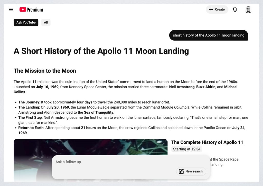 Рассмотрим, как может работать Ask YouTube на практике. Например, если вы хотите узнать о высадке экипажа «Апполон-11» на Луну: